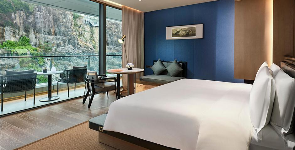 又名世茂深坑酒店,建筑格局为地上2层、地平面下16层(其中水面以下两层),共有336间客房和套房,所有客房均设有观景露台,面向深坑,观赏峭壁瀑布绝景。