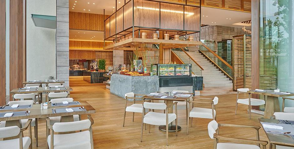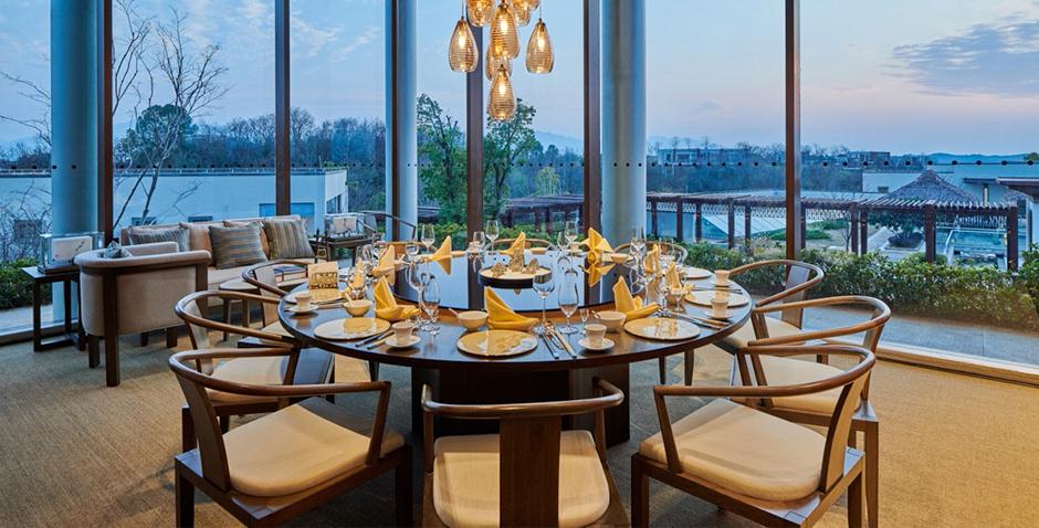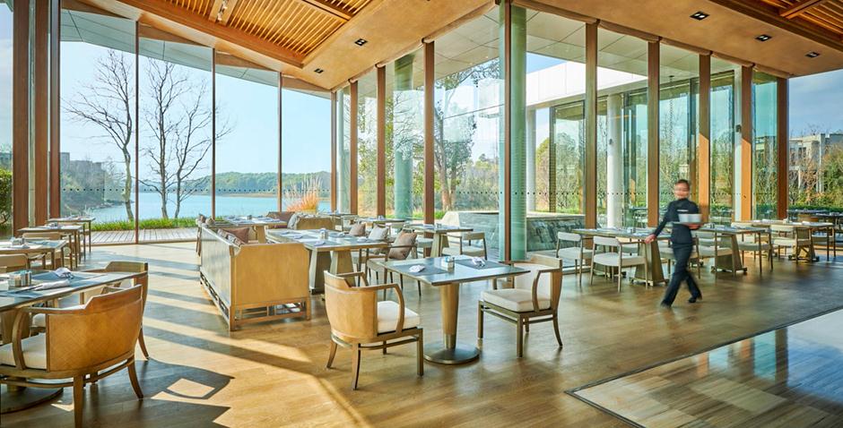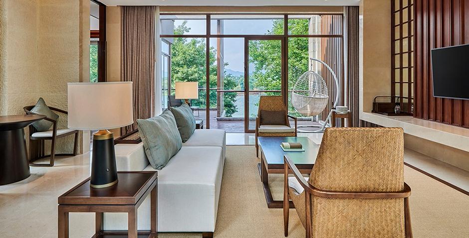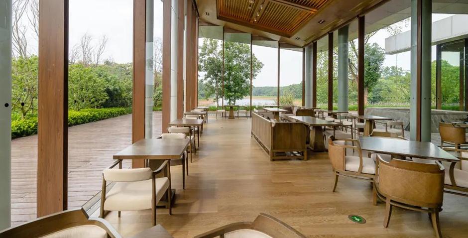 酒店由香港郑中设计师事务所(CCD)负责设计,家具由金凤凰家具集团倾力打造,将山湖相交与新中式设计元素相互融合,景中有景,交相呼应,让宾客在酒店就能欣赏到佛教文化内涵深厚的云居山和碧波万顷、绿岛拥翠的柘林湖。