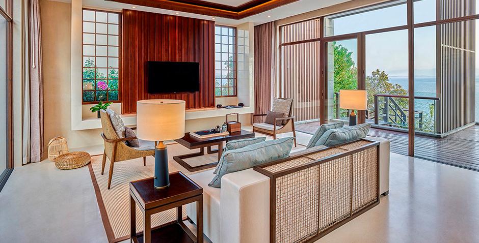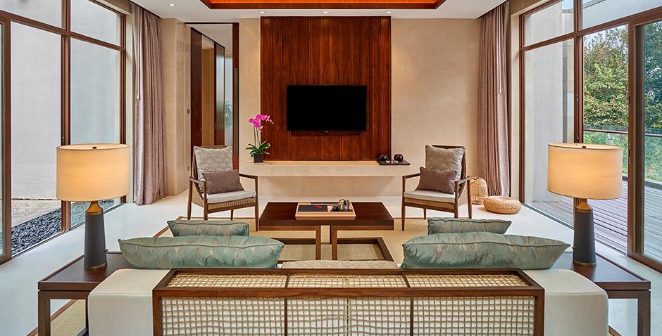 110间客房,面积从72平到200平不等,从豪华湖景房到豪华湖景双卧泳池套房均可以选择,其中包含70间独栋别墅套房。