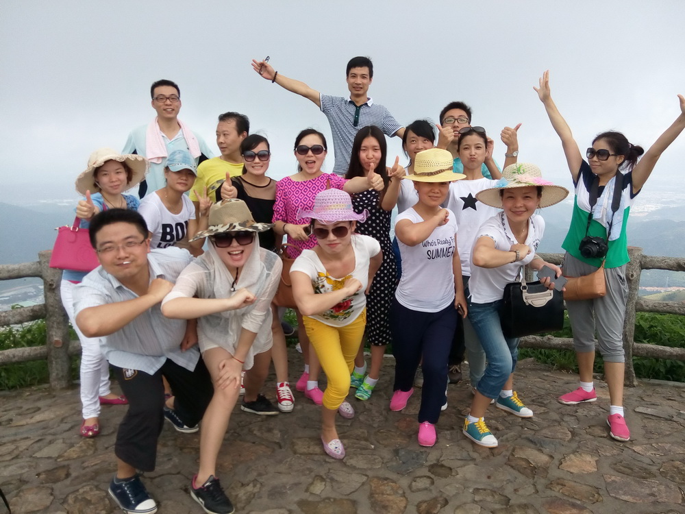 凌晨6点从公司出发,7点准时开始登山。此时,分组时选举的组长起了带头作用。凤凰队的队长张凌峰,看上去弱不禁风的他,居然第一个登上了顶峰。几个极少运动的队员,也在队友相互鼓励和帮助之下,也登上了顶峰。在顶峰观景平台上,呐喊、欢呼、跳跃、拥抱,真个平台被这欢快的气氛所笼罩。“我终于克服自我了;我终于登上来了;我真没想到我还真的做到了。。。。。。”